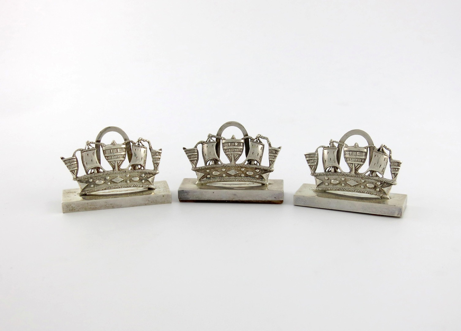 in the form of Naval Crowns, on rectangular bases, length 7cm. (3)