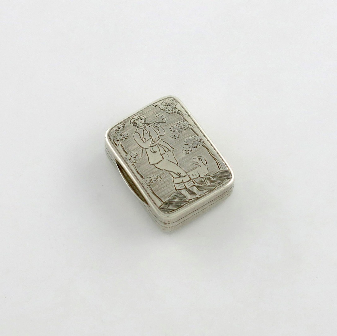 rectangular form, the hinged cover engraved with a woodcutter smoking a pipe, with his dog at his feet, the interior with a silver-gilt pierced grille with a basket of flowers, length 3cm, approx. weight 0.5oz.