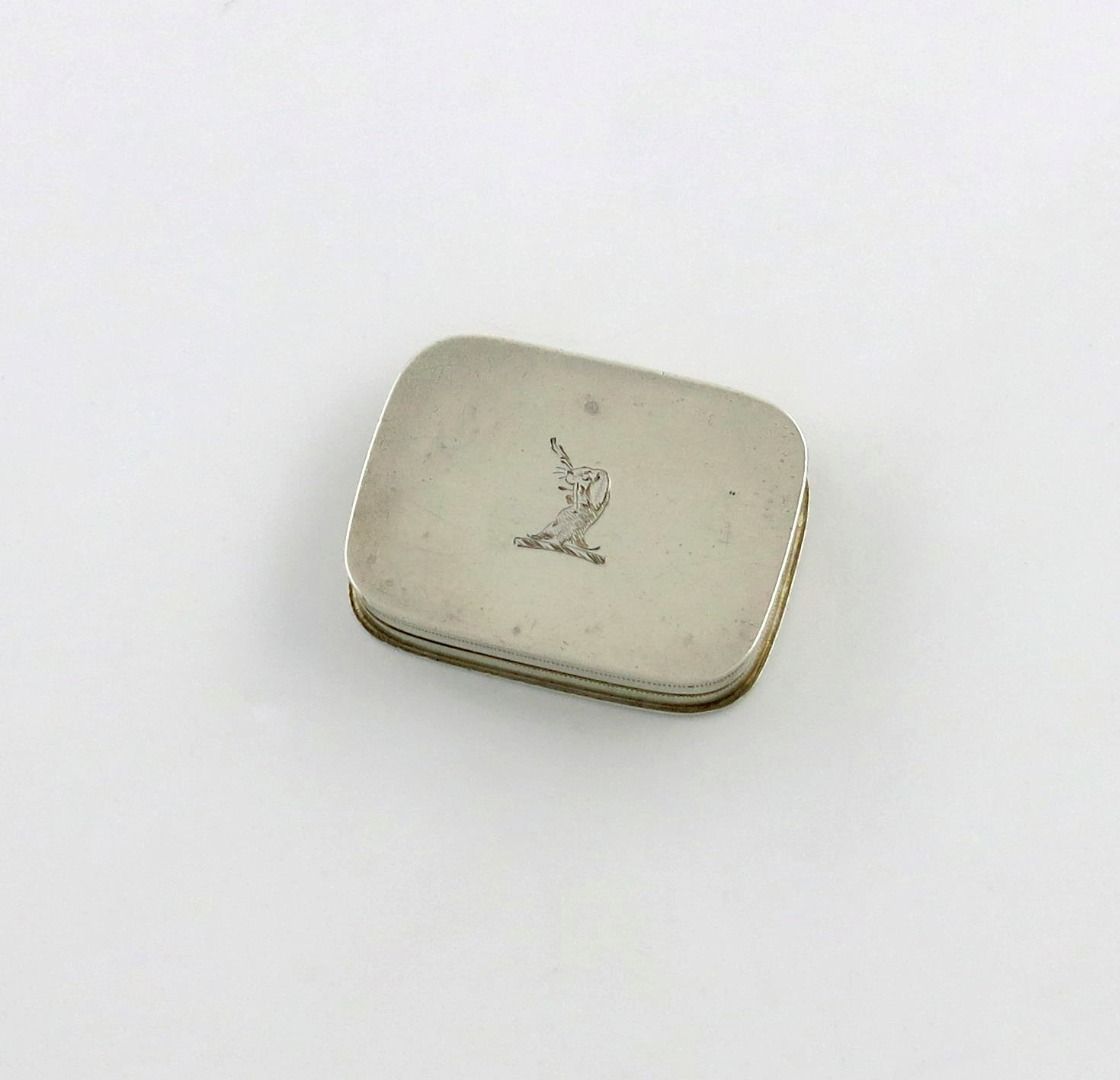 rectangular form, the hinged cover with a crest, the base with a foliate motif, the interior with a silver-gilt pierced grille with flags, a drum, a sabre, two horns, and two fleur de lys and roses, length 3.7cm, approx. weight 0.7oz.