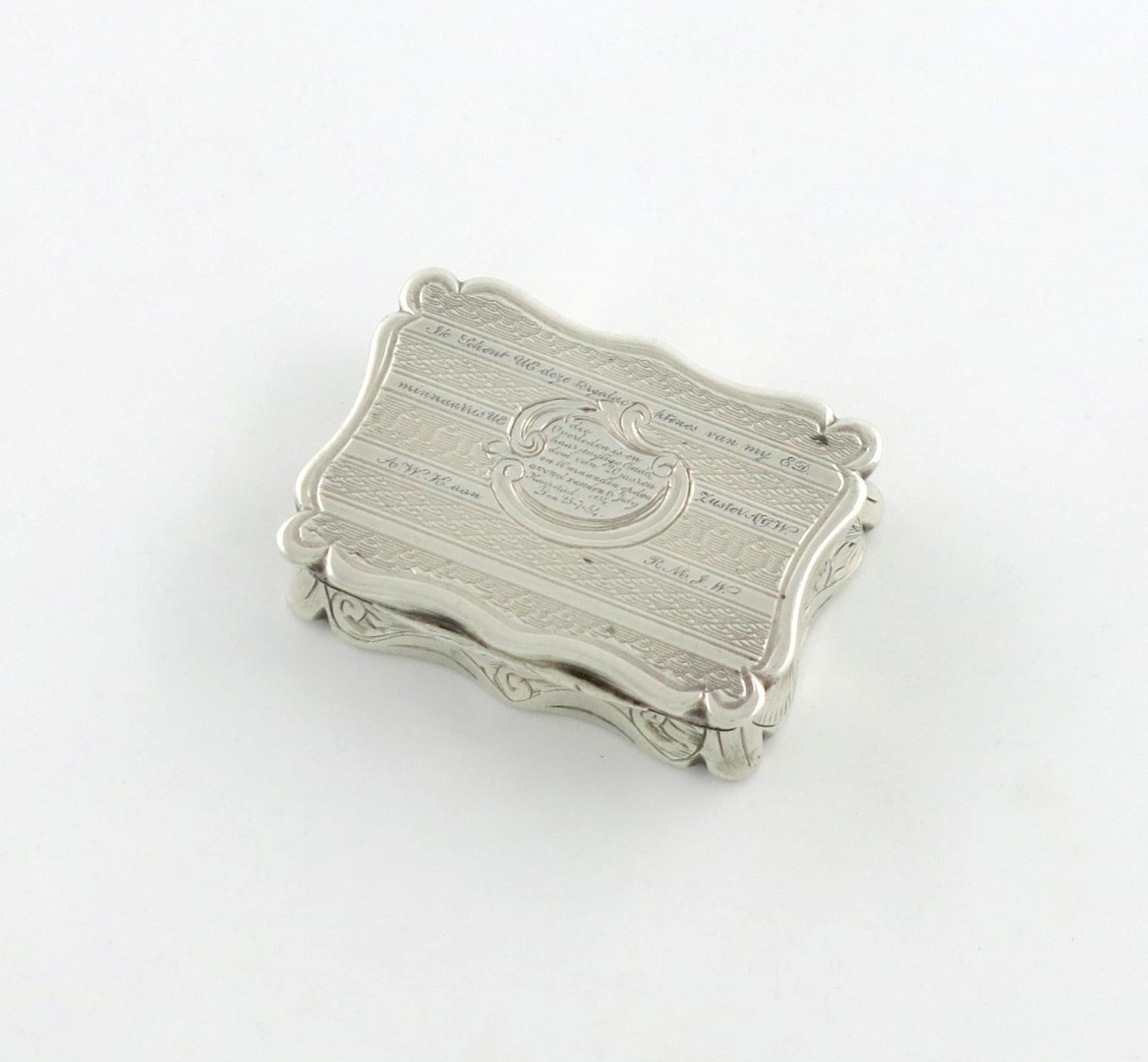 shaped rectangular form, with bands of engine-turned decoration, the interior with a silver-gilt pierced foliate scroll grille, the cover with an Afrikaans inscriptions, which roughly translates as ' I present/give you this in memory of my E.D Lover/Husband my Sister A.G.W.A.W.K... to R.M.J.W', 'The deceased was in her young age of 20 years and 10 months on the evening of 6 July, Capetown 1854'. Buried 25 07 54', length 3.8cm, approx. weight 0.6oz.
