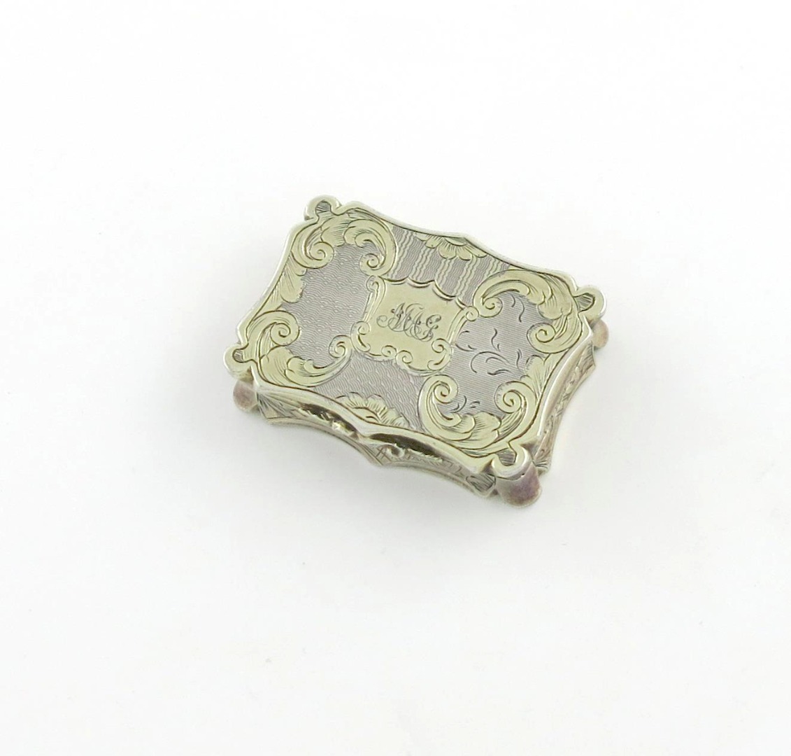 shaped rectangular form, engine-turned and foliate scroll decoration, the interior with a pierced foliate scroll grille, the cover initialled, length 3.5cm, approx. weight 0.5oz.