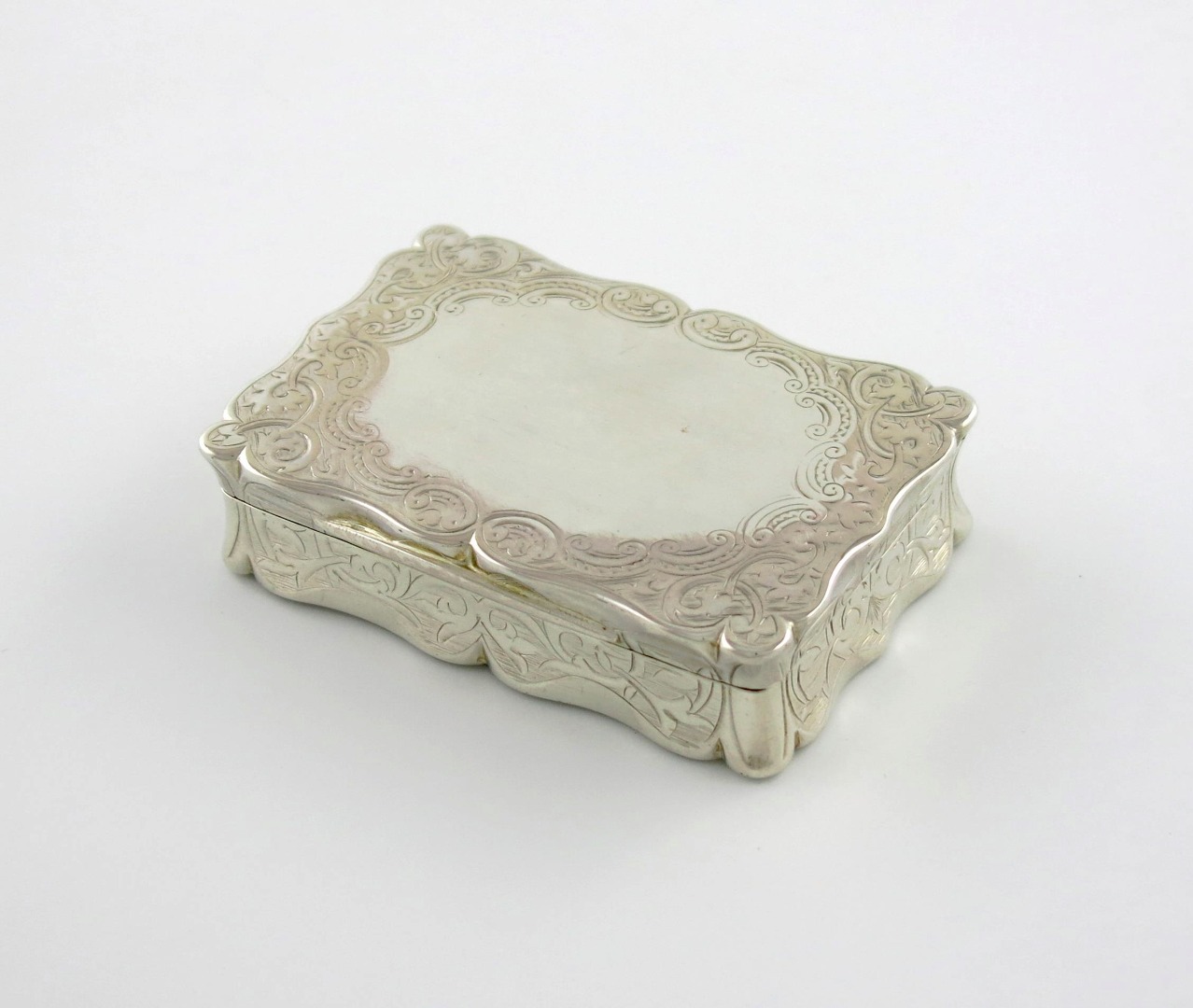 shaped rectangular form, engraved foliate scroll decoration, length 8cm, approx. weight 3.9oz.