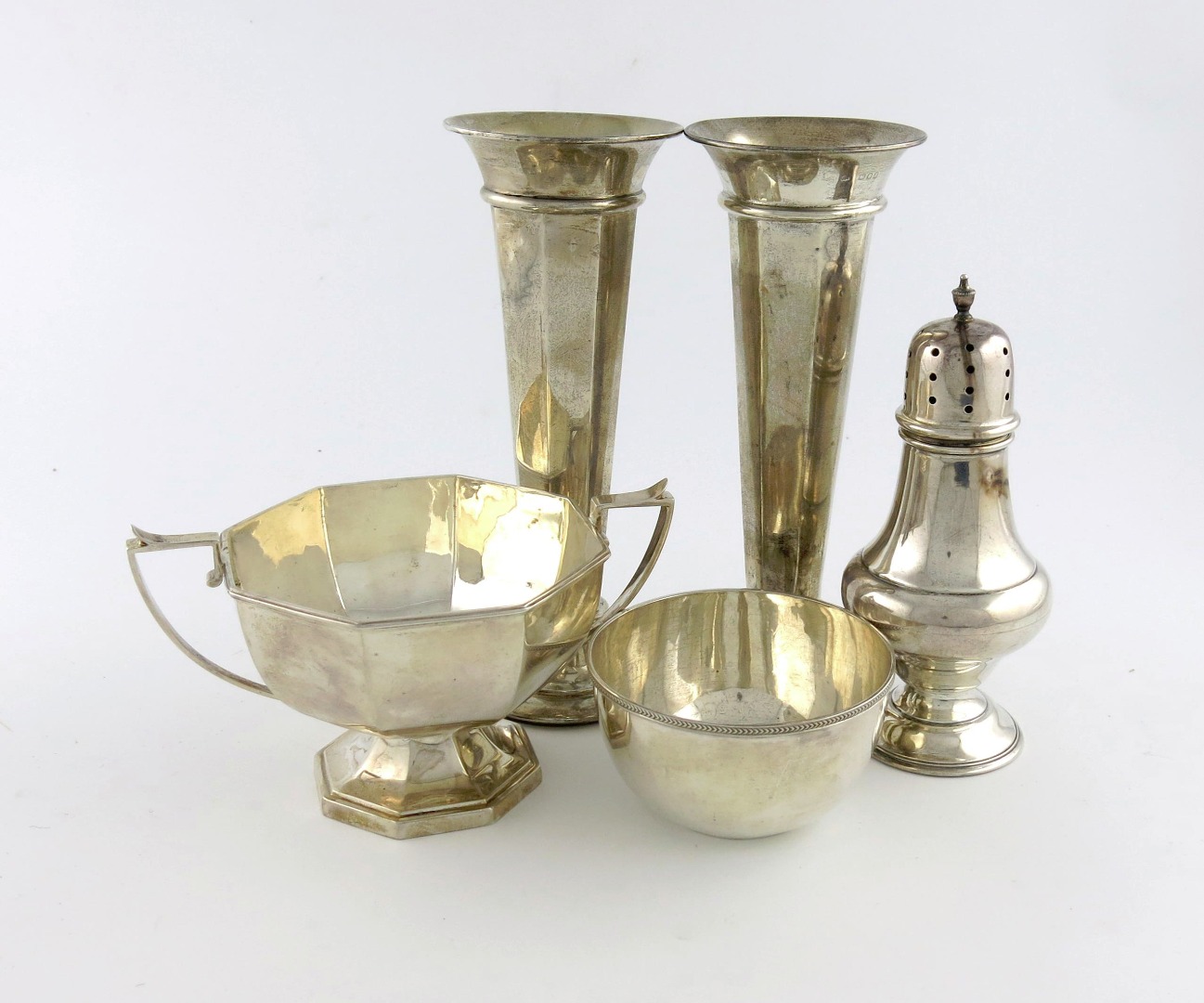 comprising: a two-handled sugar bowl, of octagonal form, by Walker and Hall, Sheffield 1934, a baluster sugar caster, a circular bowl, and a pair of vases of tapering panelled form, London 1915, height 20.2cm, approx. weight 15oz. (5)