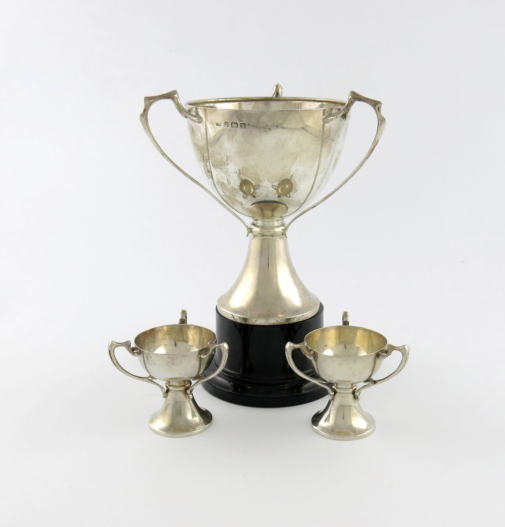 by Sanders and Mackenzie, Birmingham 1934, on a plinth, plus two smaller three-handled trophy cups, Birmingham 1903, height of tallest on plinth 20cm, approx. weight 11.5oz. (3)