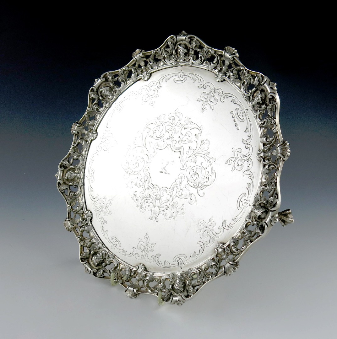circular form, with an applied cast and pierced border with masks and pierced foliate scroll decoration, the front with engraved foliate scroll decoration and with a crest, on three claw and ball feet, diameter 30.5cm, approx. weight 38.7oz.