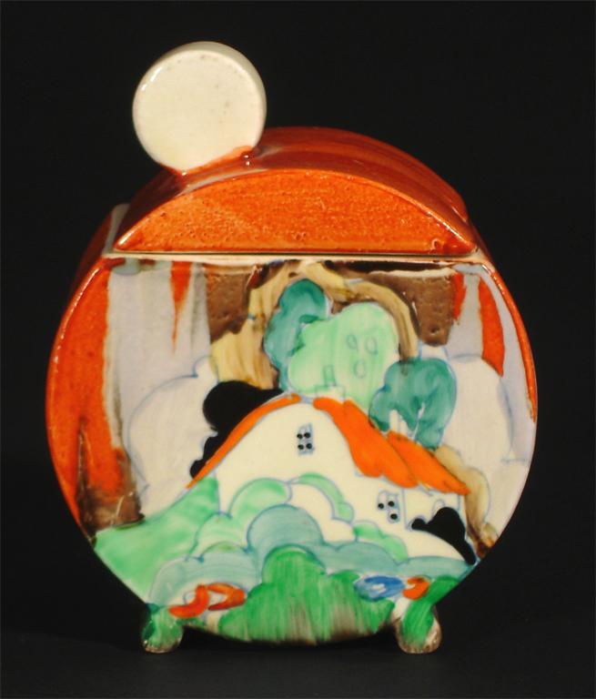 'Forest Glen' a Clarice Cliff Bon Jour preserve pot and cover painted in colours printed factory...