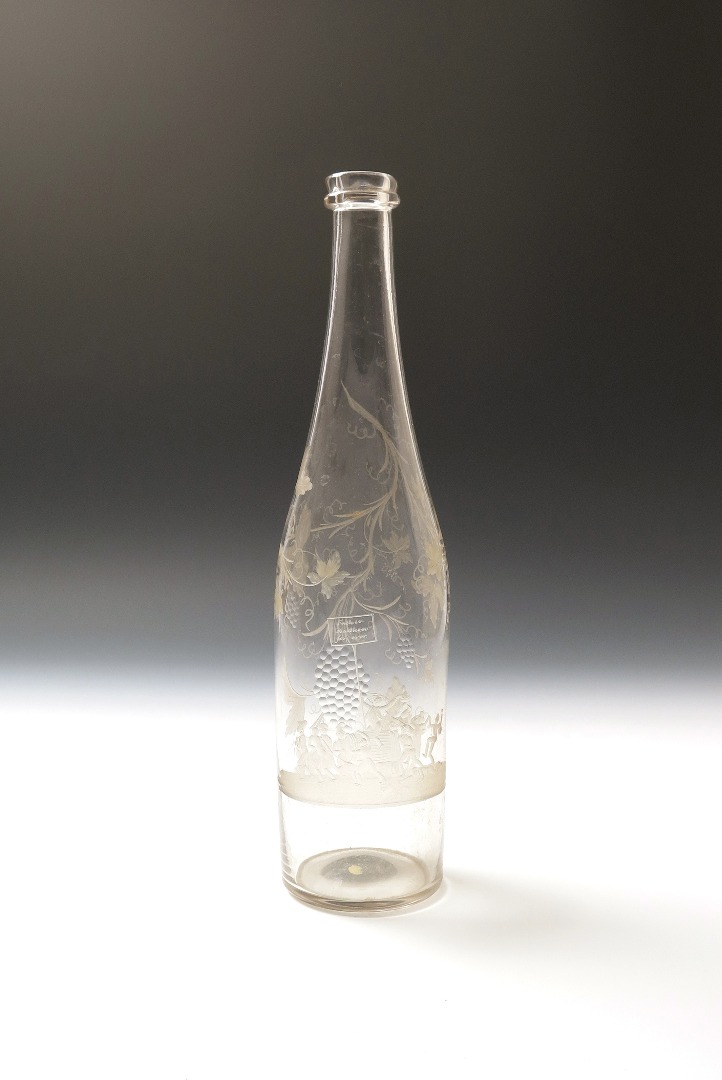 A Temperance subject wine bottle 19th century, the slender form engraved to one side with a figure holding a banner titled 'Father Matthew For Ever', seated astride a large barrel being pulled along by further figures while others dance behind, the reverse with a large spray of fruiting grapevine, 33,4cm.
