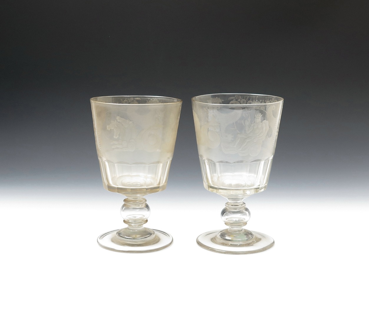 A pair of large rummers 19th century, engraved perhaps by Thomas Hudson of Newcastle, each with Neptune in a chariot drawn by three hippocampi, the other sides with the initials 'ML' between two large cornucopia of fruit and flowers, the straight-sided bowls cut with facets to the base, raised on short stems with blown knops above heavy circular feet, 22.9cm. (2)