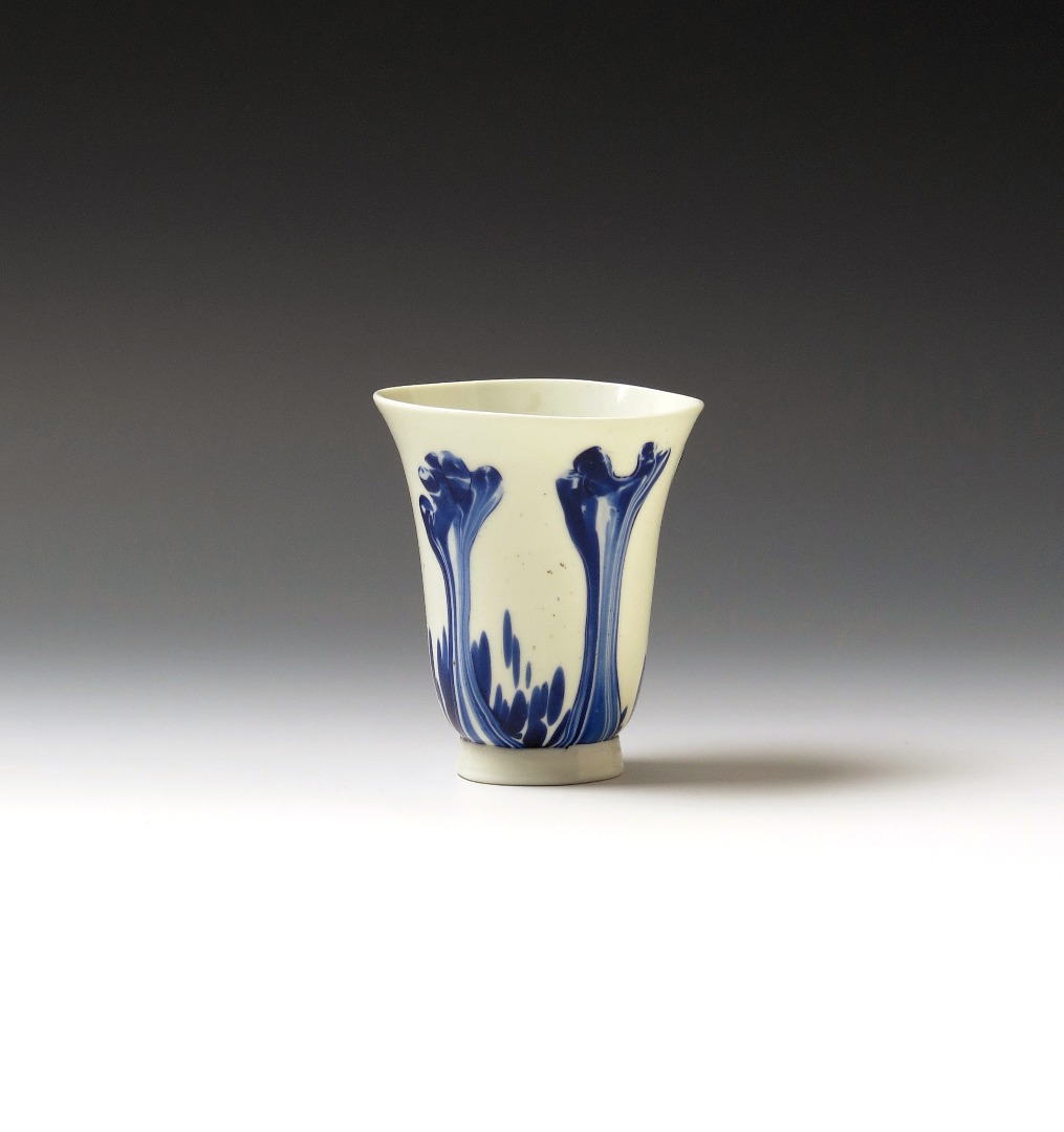 A German Milchglas beaker 17th/18th century, the tall flared body marbled with long blue splashes on an opaque white ground, raised on a tall footrim, 8cm.