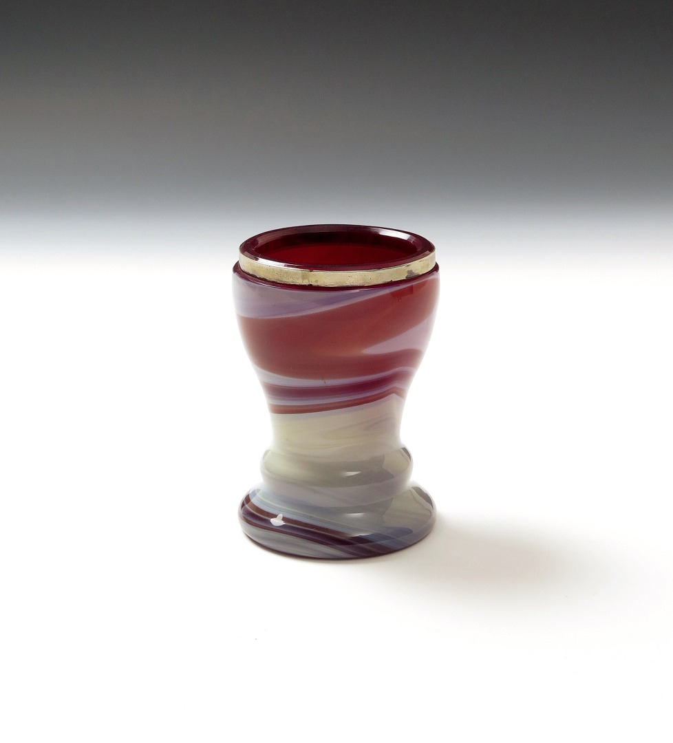 A Russian glass silver-mounted beaker late 19th century, the ruby glass body marbled to the exterior in white, blue and brown, the silver collar with Russian assay marks for 1886, 11.6cm.