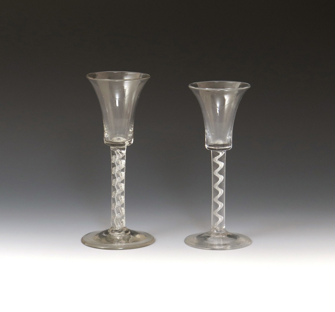 Two wine glasses c.1760, with waisted bucket bowls, one raised on a cable airtwist stem, the other on a double series airtwist with three line spiral around a spiralling tear, 17cm max. (2)