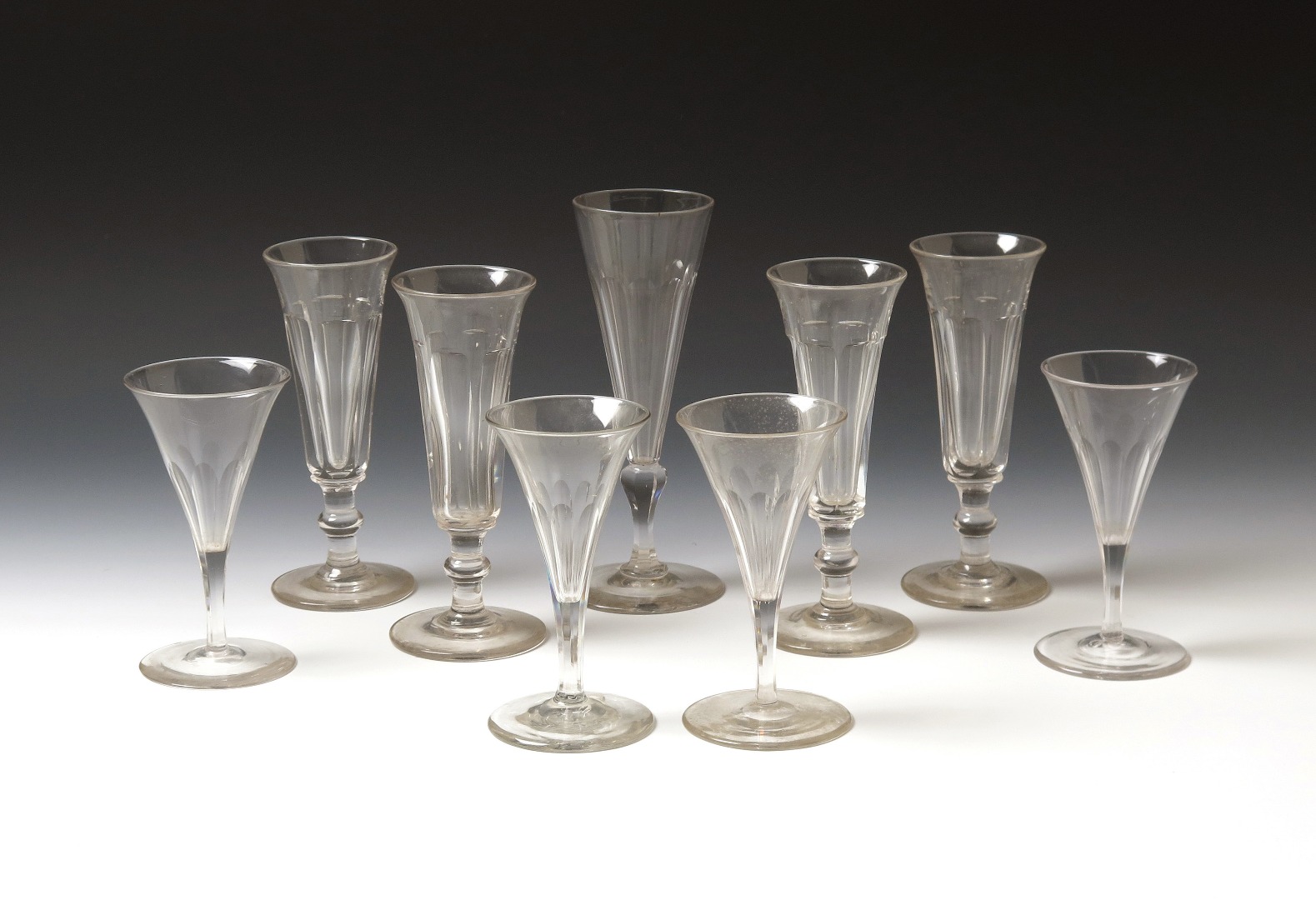Nine ale glasses 19th century, four cut with six vertical bands to each bowl, raised on plain knopped stems, four dwarf and cut with radiating bands on narrow plain stems, one on a faceted baluster stem, 17.4cm max. (9)