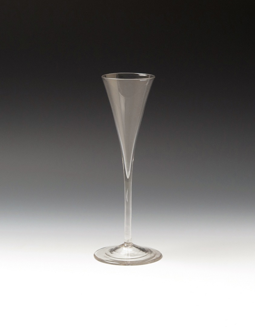 A toasting glass c.1750, with a slender drawn trumpet bowl above a fine plain stem and conical foot, 19.5cm.
