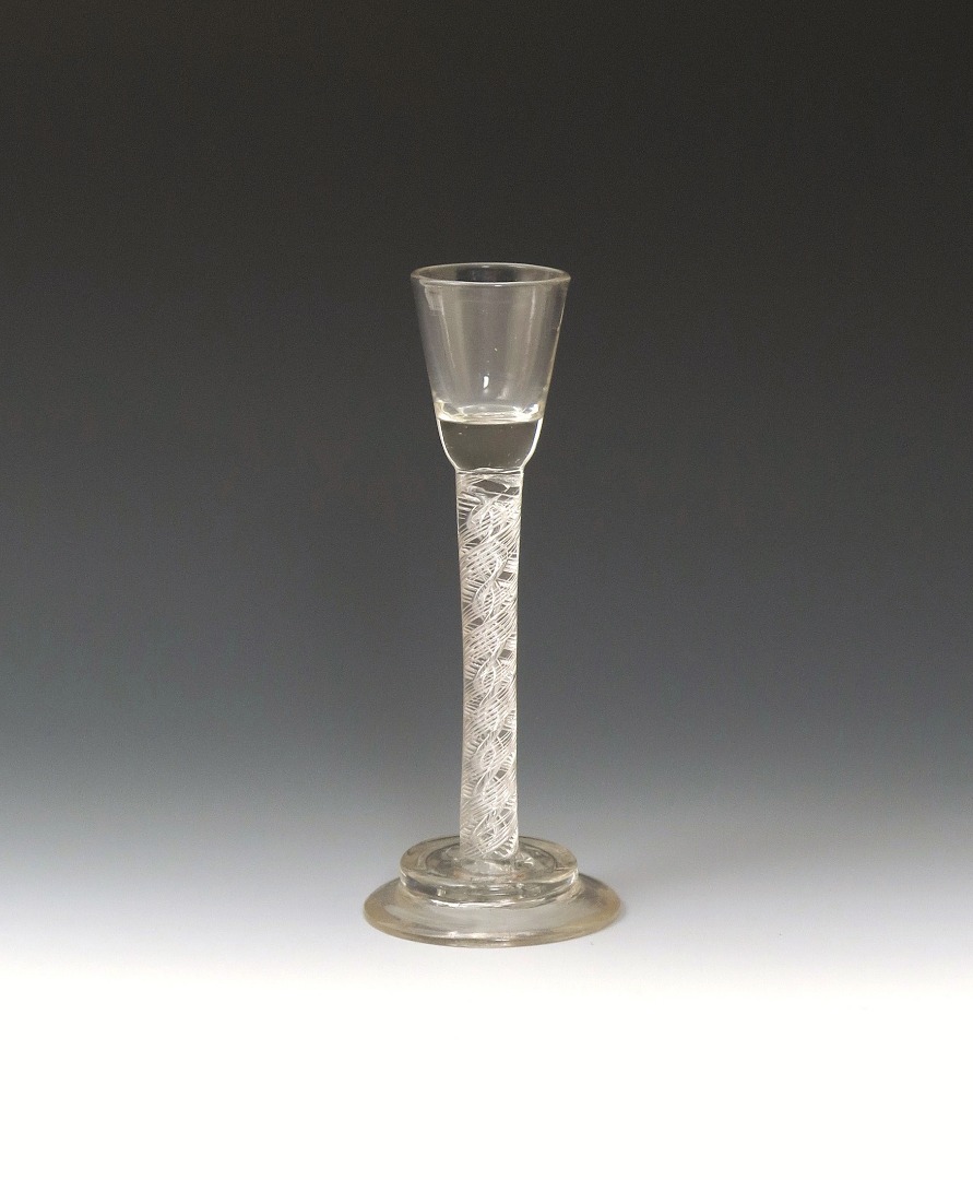 A cordial glass c.1755, with a small rounded funnel bowl raised on a thick airtwist stem above a helmet foot, 17.5cm.