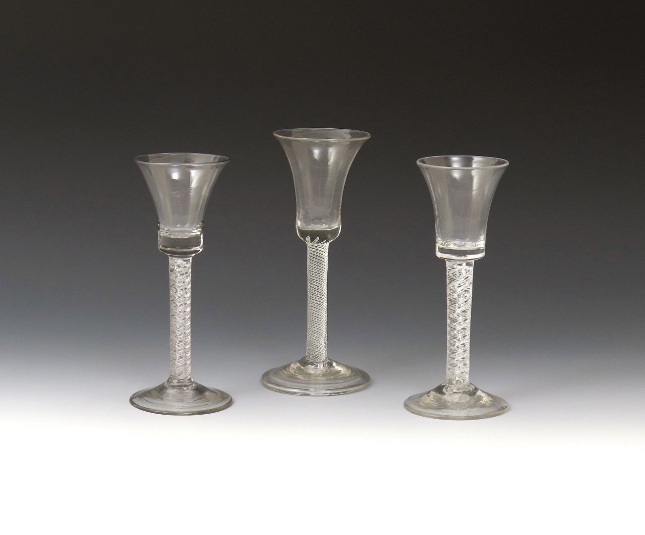 Three wine glasses mid 18th century, two with waisted bucket bowls raised on dense double series airtwist stems, the last a bell bowl on a multi-spiral airtwist above a folded foot, 17.3cm max. (3)