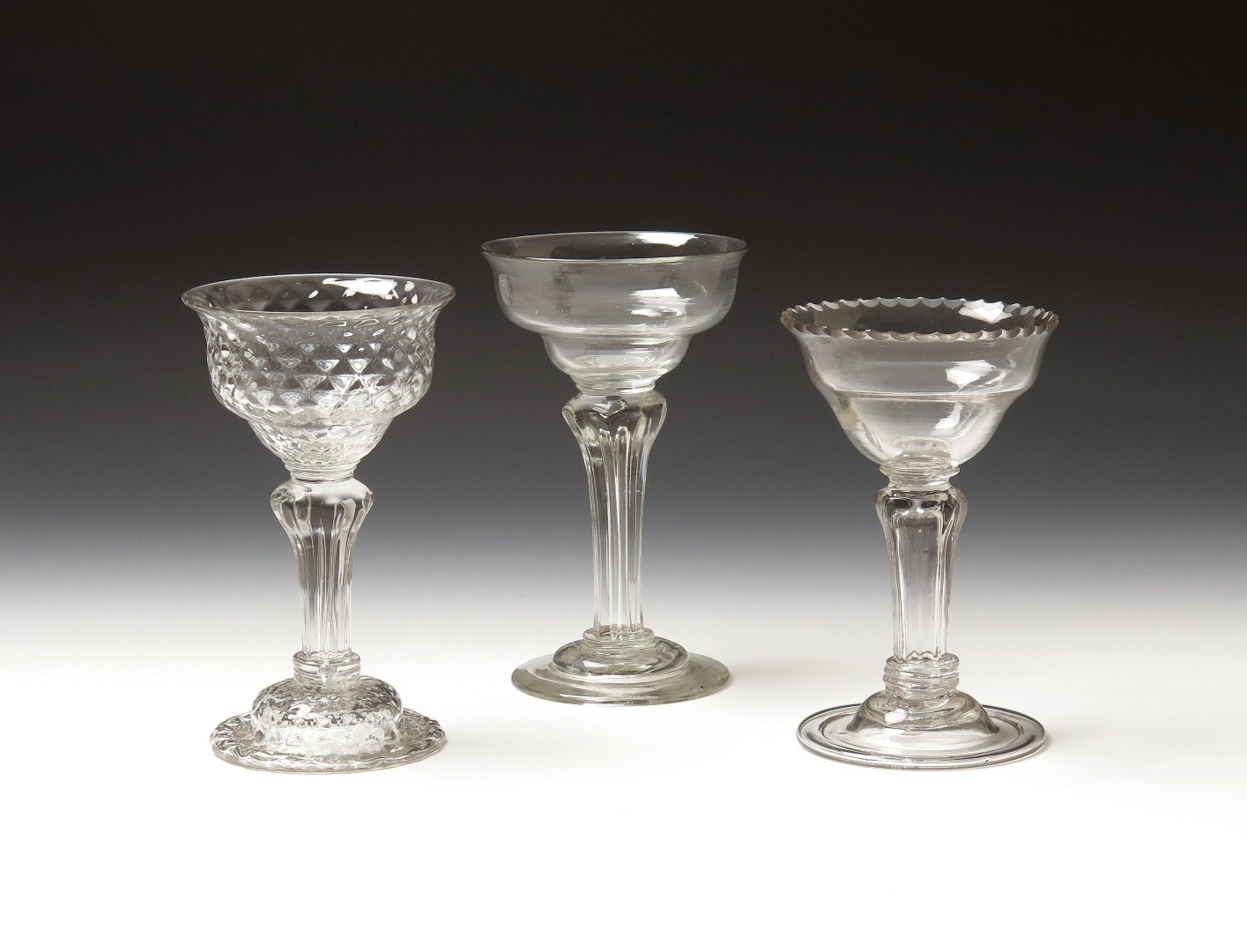 Three sweetmeat glasses mid 18th century, one with honeycomb moulding to the bowl and domed foot, the others with ogee bowls above pedestal stems, one cut with a serrated rim, rim chip to one, 16.3cm max. (3)