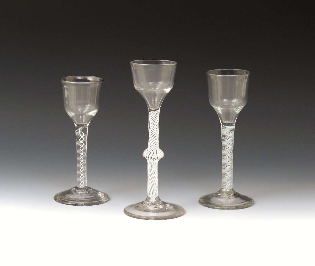 Three wine glasses c.1760-70, with ogee bowls, raised on varying opaque twist stems over conical feet, one with a central knop, a little footrim chipping, 17.5cm max. (3)