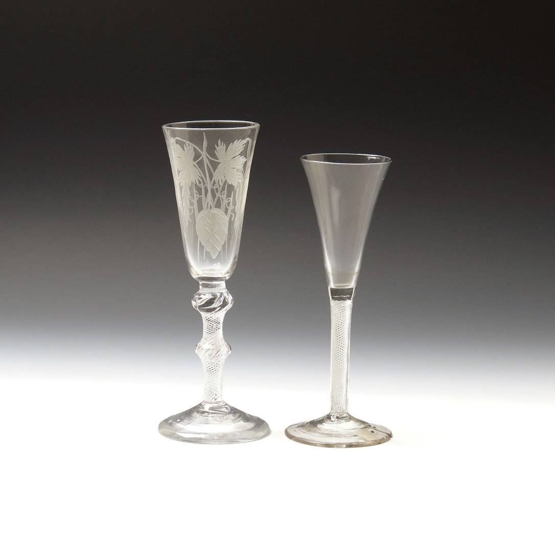 Two ale glasses c.1755, the larger with a funnel bowl engraved with hops and barley, above a double-knopped airtwist stem, the other with a narrow drawn trumpet bowl above a dense spiral airtwist, the latter's foot cracked and riveted, 20.5cm max. (2)