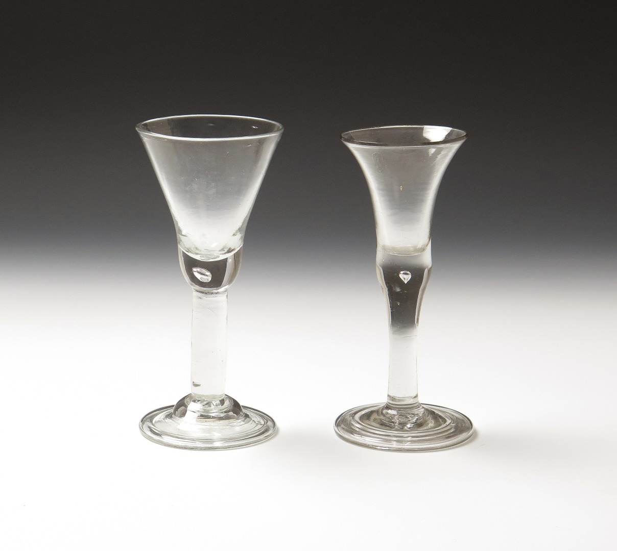 Two wine glasses mid 18th century, one with a bell bowl rising from a swollen plain stem with small single tear, the other with a rounded funnel bowl with solid teared base on a plain stem, both with folded feet, 16.8cm max. (2)