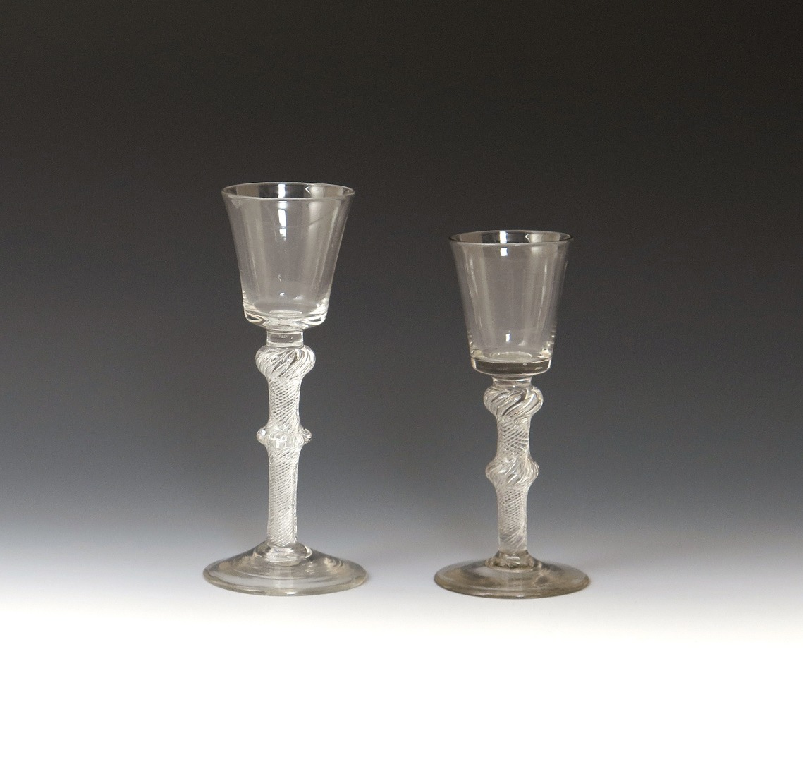 Two wine glasses c.1755, with bucket bowls raised on double-knopped airtwist stems above conical feet, 16.7cm max. (2)