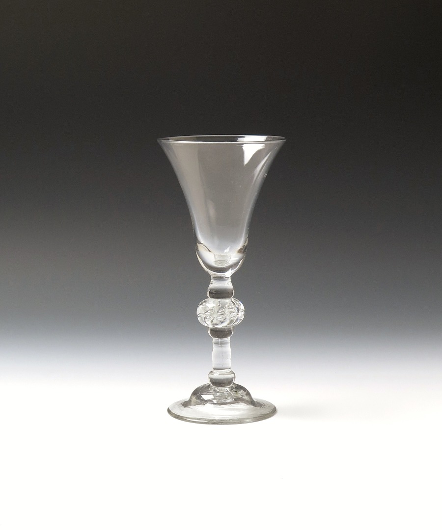 A large baluster goblet c.1740, with generous bell bowl raised on a plain baluster stem with large beaded knop enclosing two rows of tears, above a domed foot, 19cm.