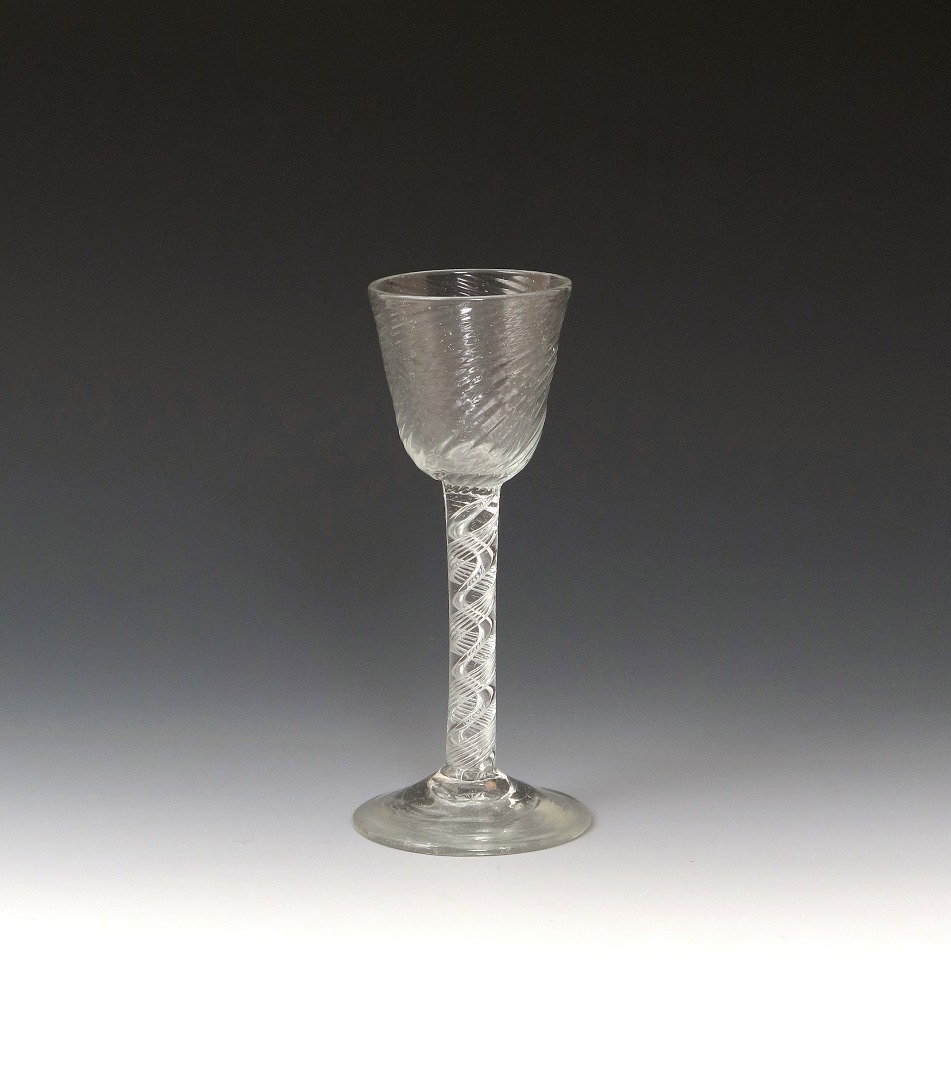 A wrythen moulded wine glass c.1755, the rounded funnel bowl with close spiral design, raised on a double series airtwist stem above a conical foot, 14.7cm.