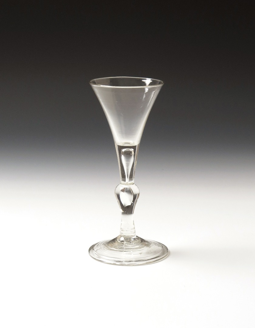 A light baluster wine glass c.1745, of Kit Kat Club type, with drawn trumpet bowl issuing from a baluster stem with long tear above a folded conical foot, 16cm.