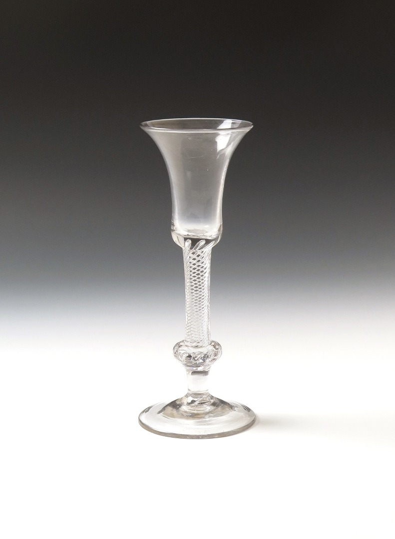 A composite stem wine glass c.1755, with a bell bowl rising on an airtwist stem above a low knop with two rows of air beads or tears, 18.4cm.