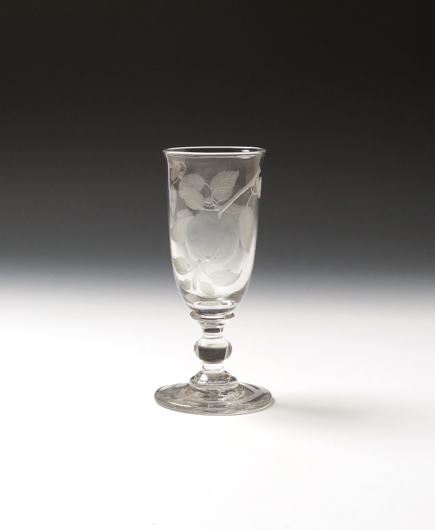 A cider glass early 19th century, the tall funnel bowl well engraved with fruiting sprays of pears and apples, raised on a short plain stem with central ball knop, 14.8cm.