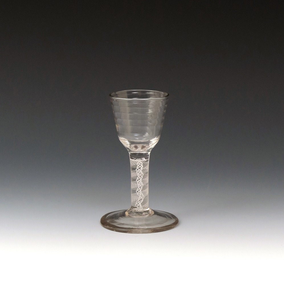 A small Lynn glass c.1760-65, with a round funnel bowl moulded with horizontal bands, raised on a short double series opaque twist stem, small footrim chips, 10.5cm.