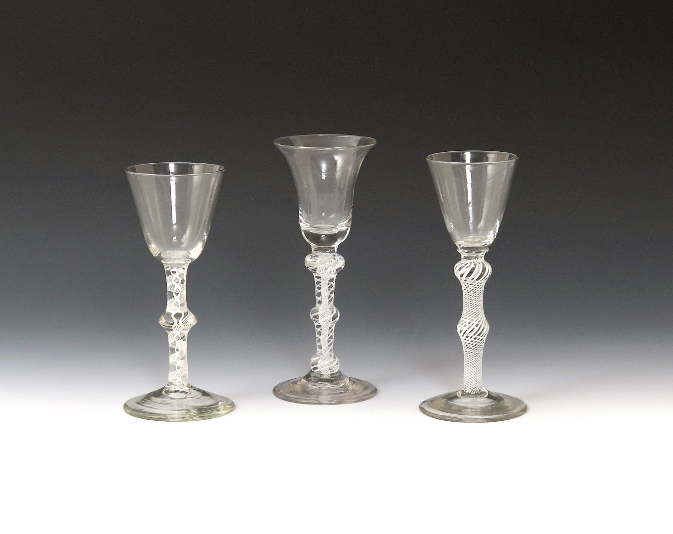 Three wine glasses c.1765, one with a rounded funnel bowl raised on a double series opaque twist stem with central knop, another with a similar bowl on a double-knopped opaque twist stem, the last with a bell bowl over a double series opaque twist stem with shoulder, central and basal knops, 16.5cm max. (3)