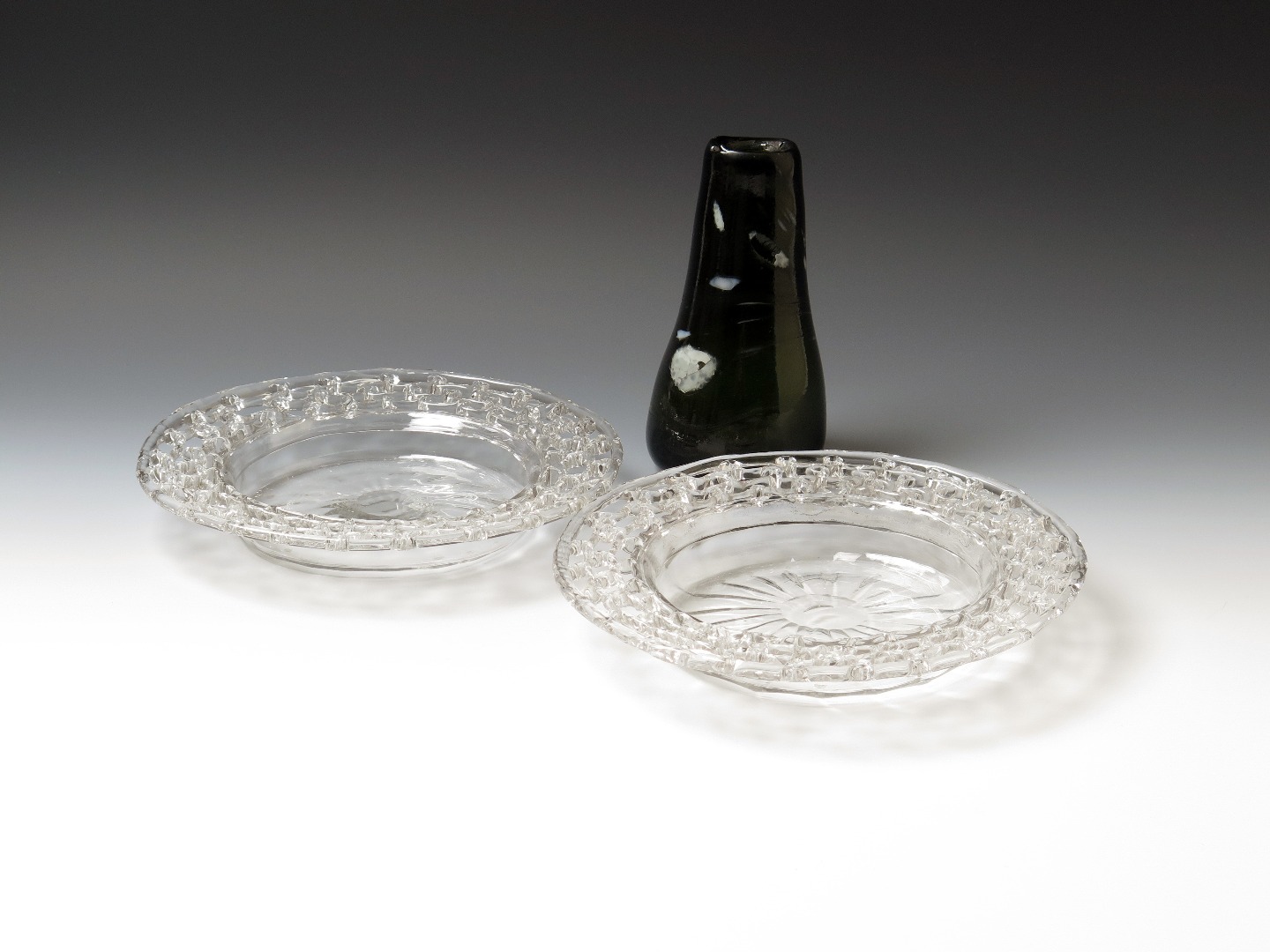 A small glass vase of Wrockwardine/Nailsea type early 19th century, the tapering form of a deep green colour with swirls and splashes of white, and a pair of Liege openwork glass basket stands or dishes, 22cm max. (3)