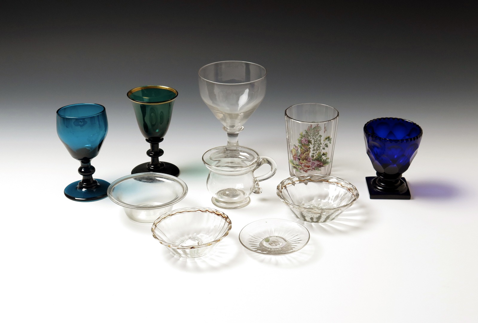 A small collection of glass items 18th century and later, including three small bowls with folded rims, a moulded patch stand, a syllabub cup, a clear glass rummer, two green wine glasses, an enamelled and faceted beaker, and a facet-cut blue glass on a square base, 12.6cm max. (10)