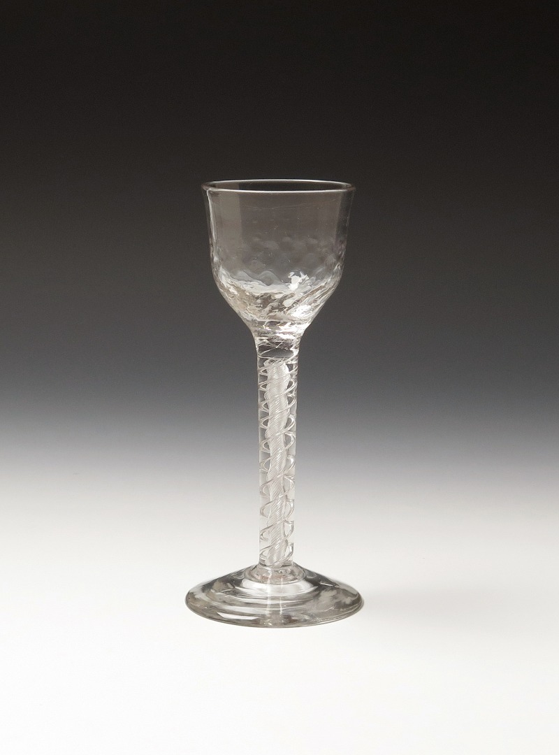 A small wine glass c.1750, the funnel bowl with honeycomb moulding, raised on a dense double series airtwist stem and conical foot, 14.3cm.