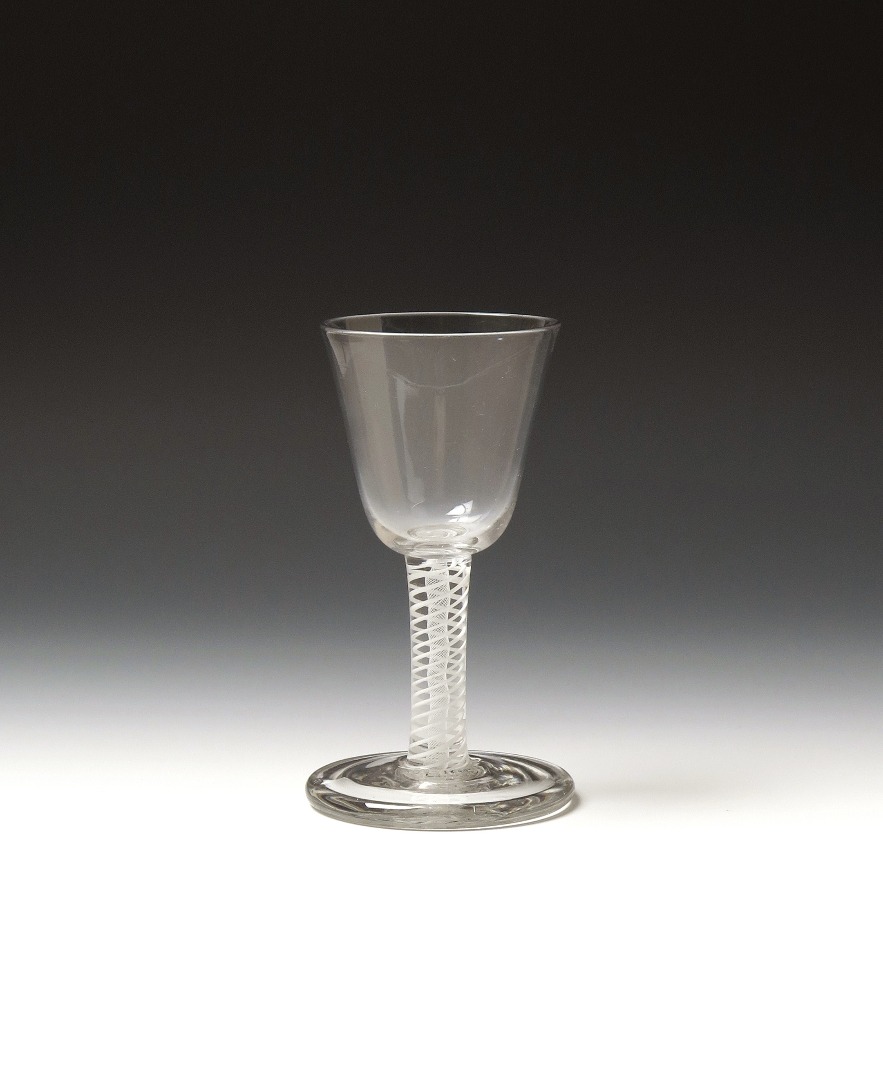 A firing glass c.1760, the generous funnel bowl raised on a short double series opaque twist stem above a heavy firing foot, 13.5cm.