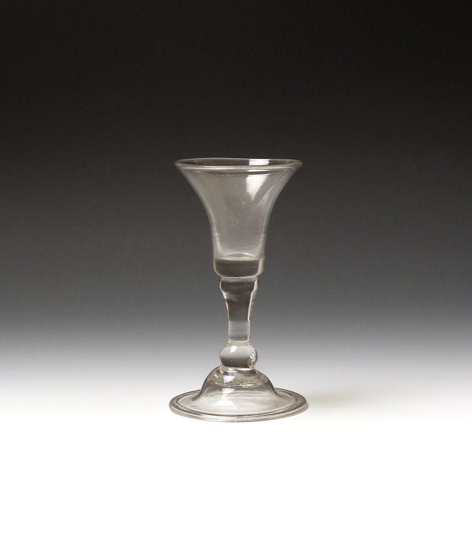 A small baluster wine or gin glass c.1730, the bell bowl rising from a short baluster stem with basal knop above a folded foot, 12cm.