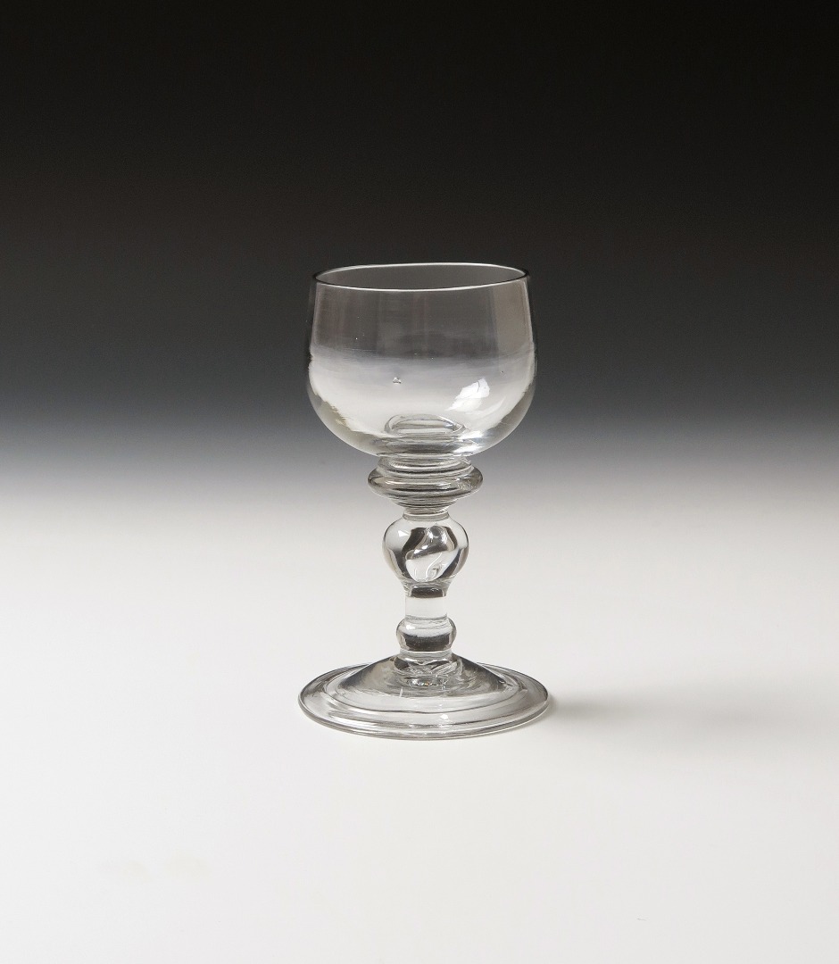 An unusual baluster wine glass c.1750, with rounded bowl raised on a teared baluster stem with triple-ring knop and a small basal knop above a folded foot, 13cm.