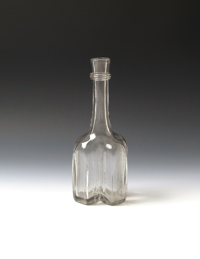 A good cruciform carafe or stopperless decanter c.1740, the long tapering neck applied with a triple neck ring, 24cm.
