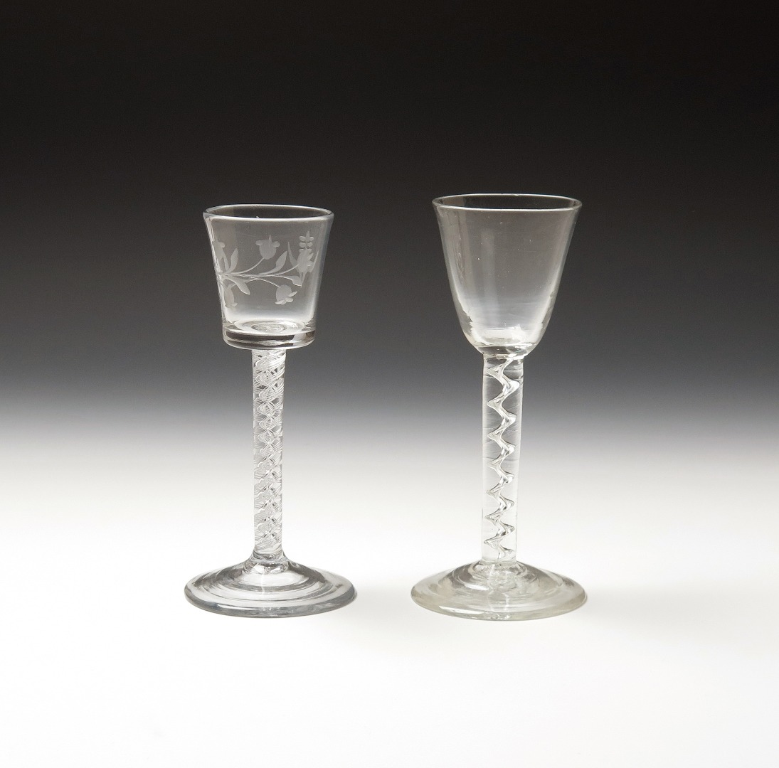 Two wine glasses c.1760, one with a rounded funnel bowl raised on a mercury twist stem, the other with a bucket bowl engraved with a lily of the valley spray and a smaller sprig, raised on a double series airtwist stem, 15.8cm max. (2)