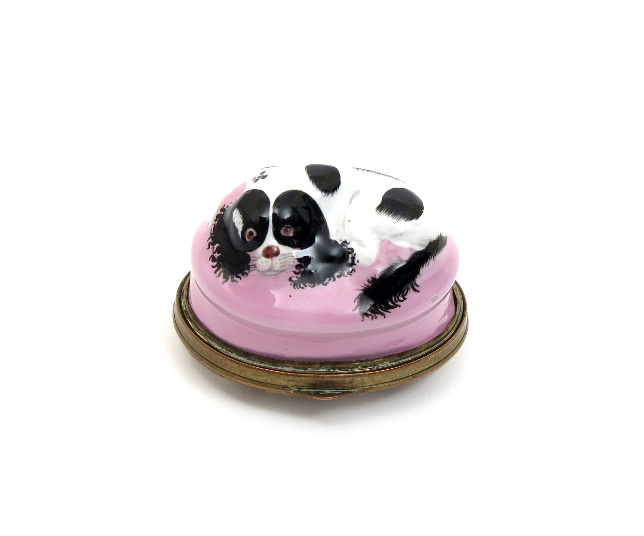 An English enamel bonbonnière c.1780, modelled as a recumbent black and white spaniel on a pink base, the hinged lid inscribed 'Thou has no fault or I no fault can spy, Thou art all beauty or all blindness I', some good restoration, 4.2cm.