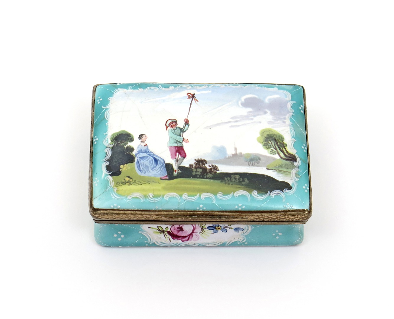 A South Staffordshire enamel snuff box c.1770, the rectangular lid painted with a figure flying a kite beside a seated lady wearing a blue dress, the sides with panels of flowers reserved on a pale green ground with white raised enamels, a little good restoration, 7.4cm.