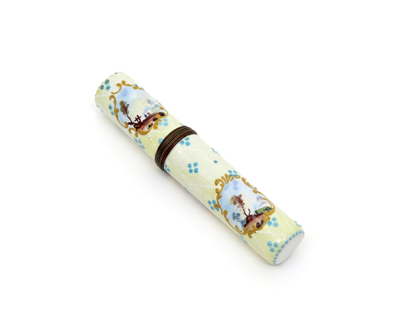 An English enamel etui or bodkin case c.1775, the wide cylindrical form painted with small shaped panels of figures in rural landscapes, reserved on a pale yellow ground with a diamond pattern of raised white enamel and turquoise dots, some good restoration, 13cm. (2)