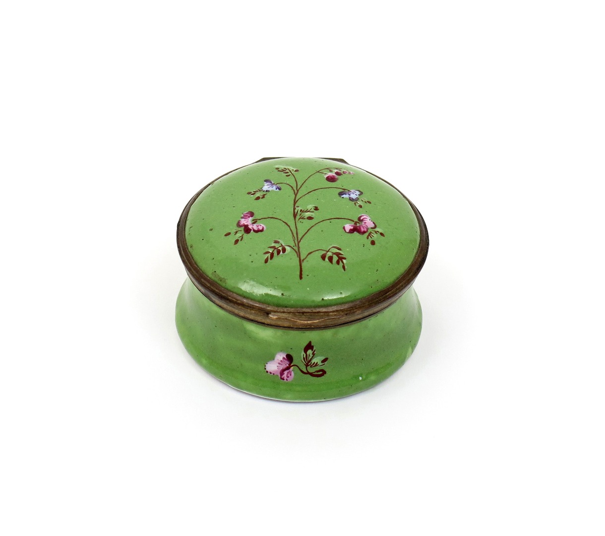 A Bilston enamel circular patch box c.1780-90, simply decorated with a spray of raised enamel flowers on an apple green ground, the interior of the lid fitted with a mirror, 5cm.