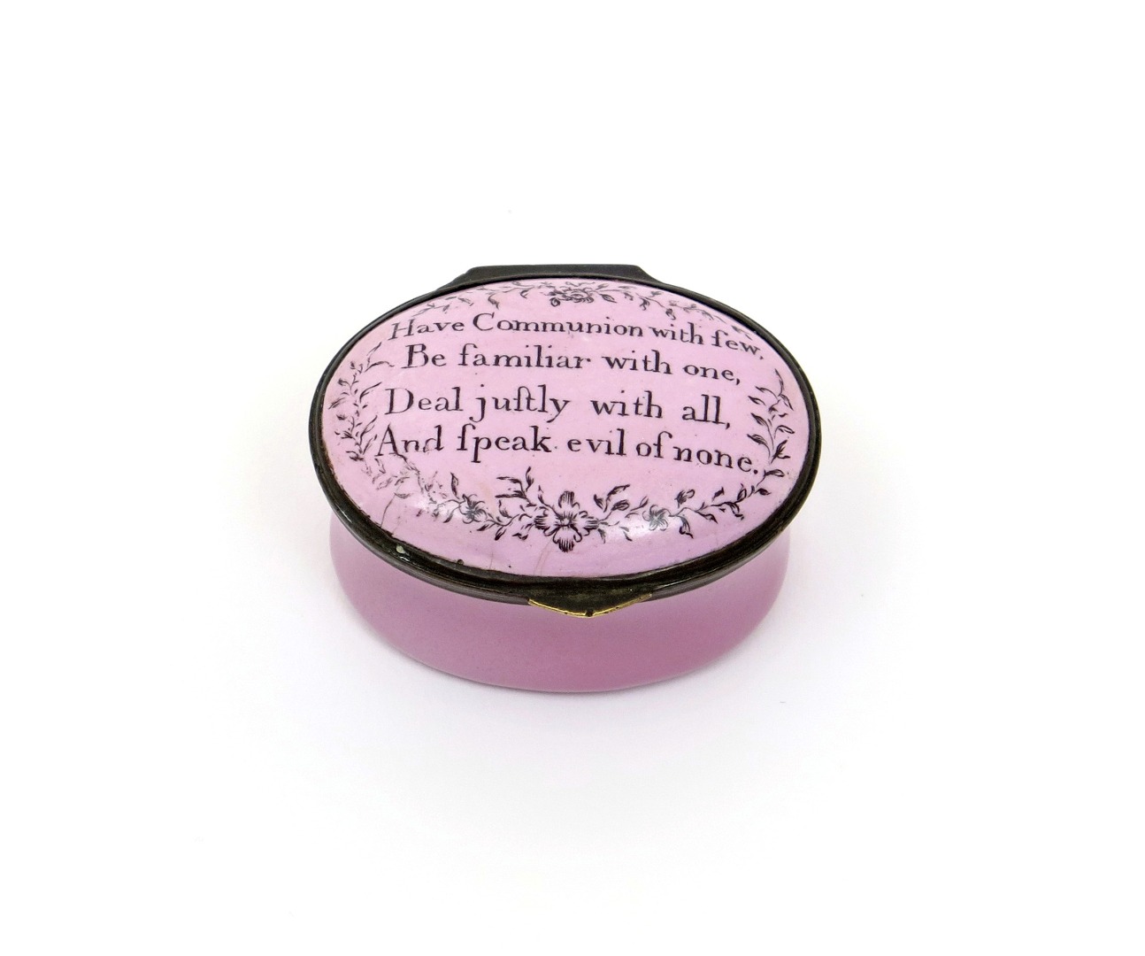 An English enamel patch box c.1780-90, the oval form inscribed in black to the lid with 'Have Communion with few, Be familiar with one, Deal justly with all, And speak evil of none', within delicate flower sprays on a pink ground, the inside of the lid with a mirror, some good restoration to the base, 4.3cm.