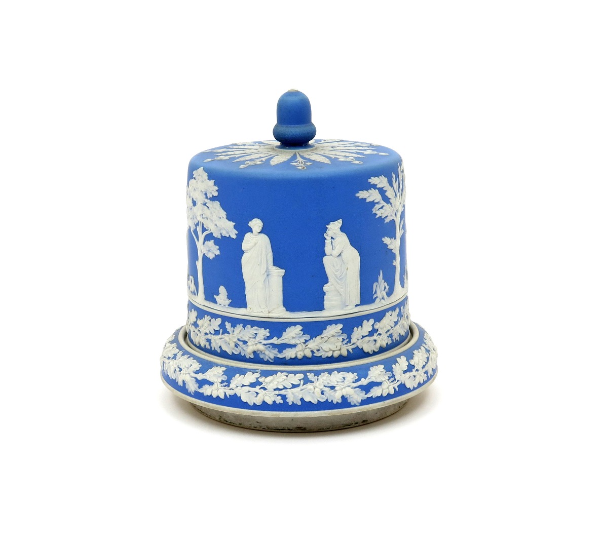 A Jasperware cheese bell and stand 19th century, the domed cover applied with Classical figures between tall trees, above bands of oak leaves, the flat top with acanthus leaf and bell flower motifs around an acorn finial, the base restored, 27cm high. (2)