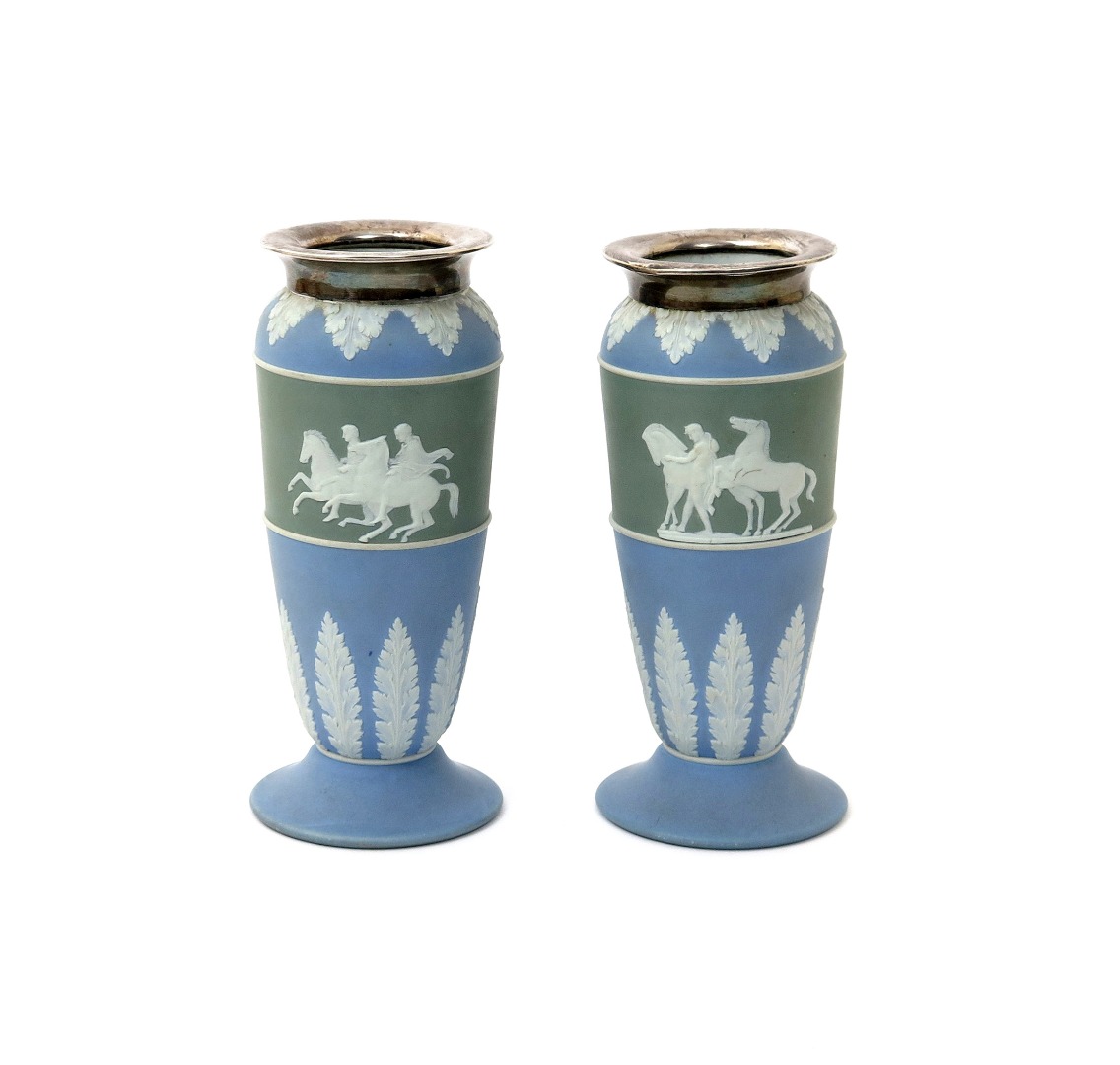 A pair of Wedgwood tricolour Jasperware vases 19th century, the slender ovoid bodies decorated with applied Classical equestrian figures in white on a sage green ground, between formal acanthus leaf bands on pale blue, with later silver mounts to the rims, hallmarked for Chester 1911, impressed WEDGWOOD marks, 19.5cm. (2)