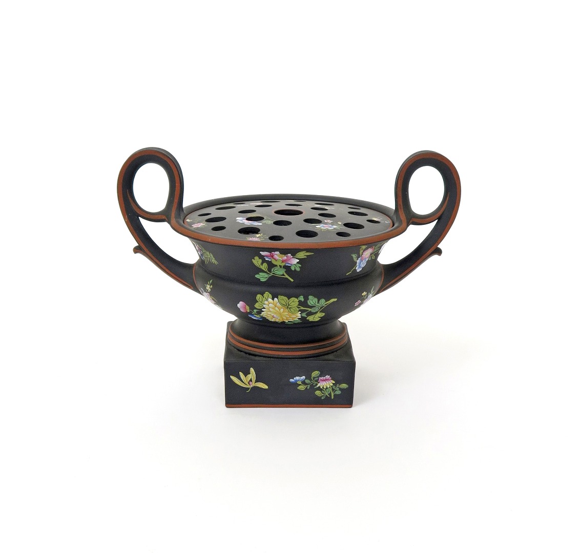 A Wedgwood black basalt pot pouurri vase and two covers c.1820, of Krater form, with wide two-handled body painted with Oriental flowers in polychrome enamels, edged in terracotta bands and raised on a square base, impressed WEDGWOOD mark, some chipping, 24.5cm high.