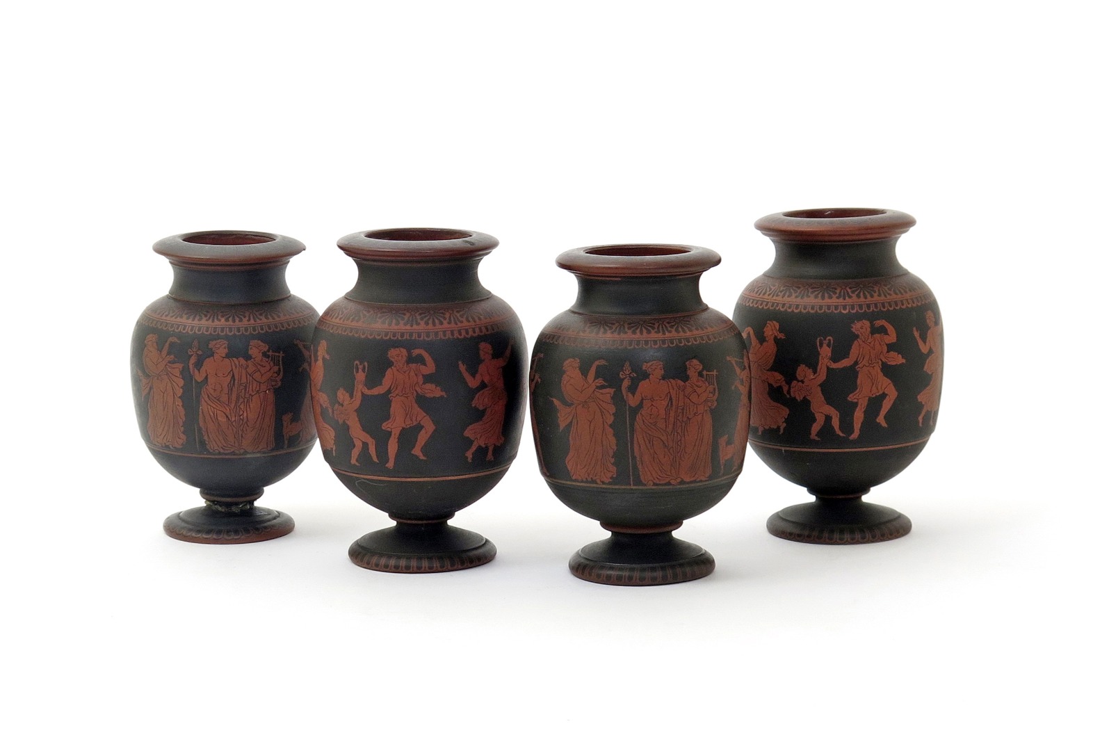 Four small encaustic decorated black basalt vases 1st half 19th century