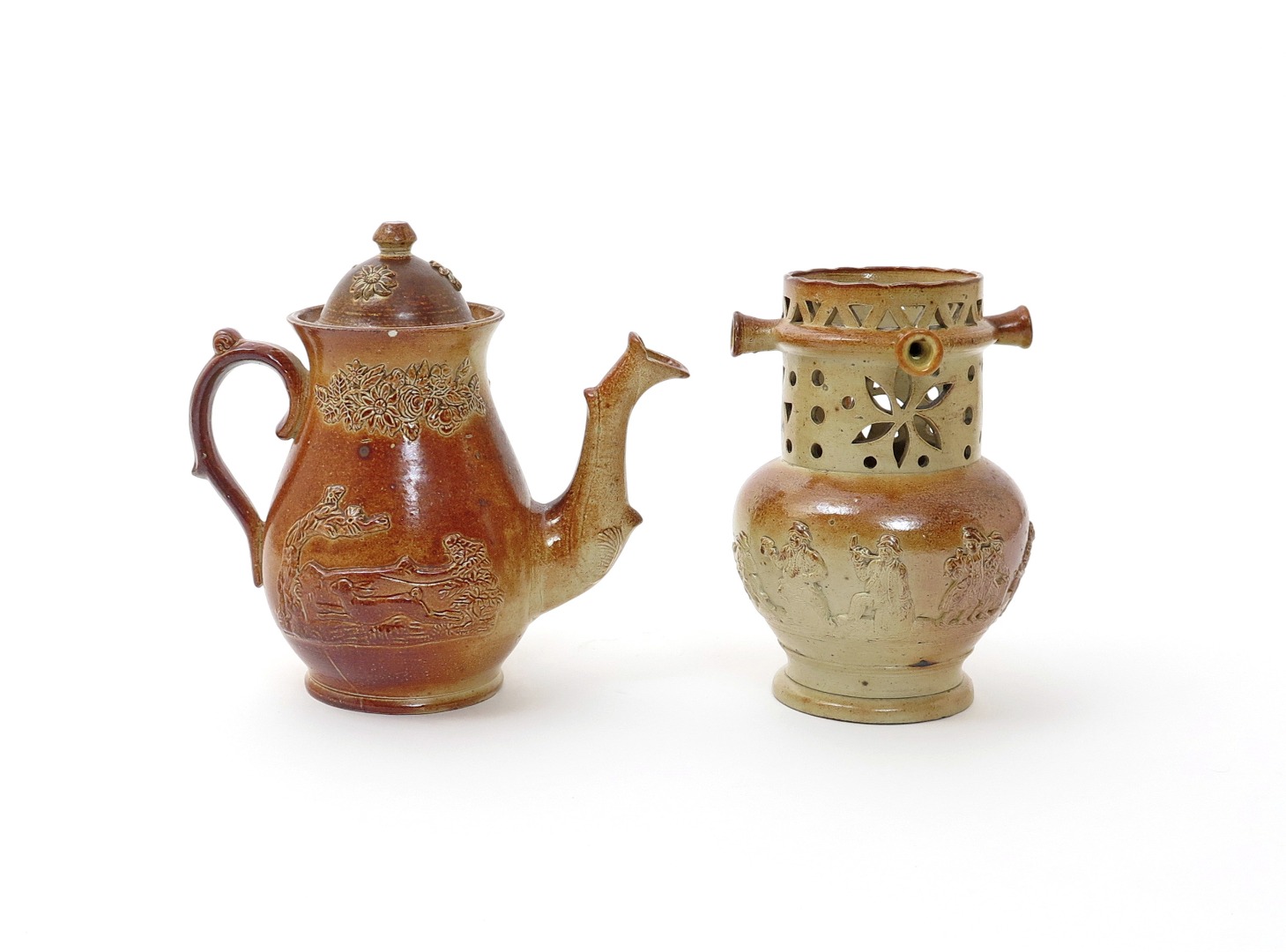 A Derbyshire (Brampton) brown stoneware puzzle jug c.1840, and a similar coffee pot and cover, the jug sprigged with topers beneath an elaborately pierced tall neck, the coffee pot with a hare to one side and pheasant to the other, beneath typical floral sprays, minor faults, 25cm max. (3)