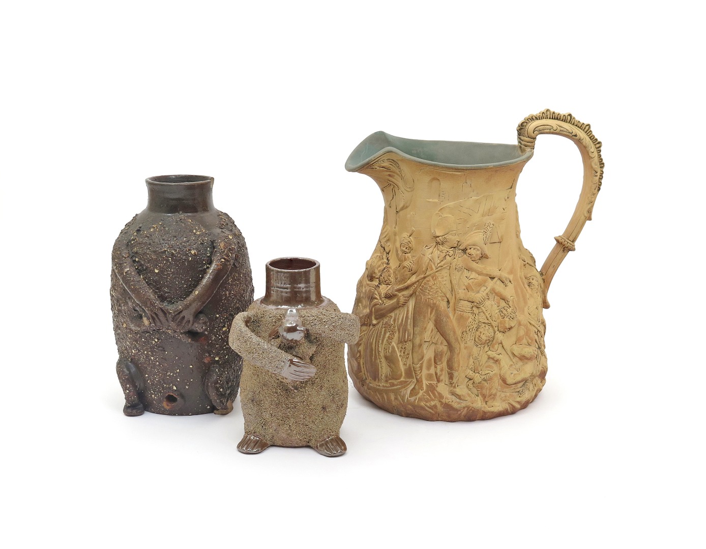 Two stoneware bear tobacco jars c.1770, applied with clay frit, each holding a cub between its paws, and a massive earthenware jug moulded in high relief with the victory of Ralph Abercromby in Egypt, c.1800, the bear jars lacking covers, the jug restored, 38cm max. (3)